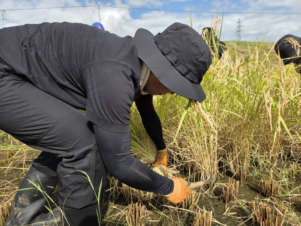 社員皆の協力のもと、田んぼの四隅は鎌を使って手刈りし、残りはコンバイン(稲刈り機)で刈り取りました。